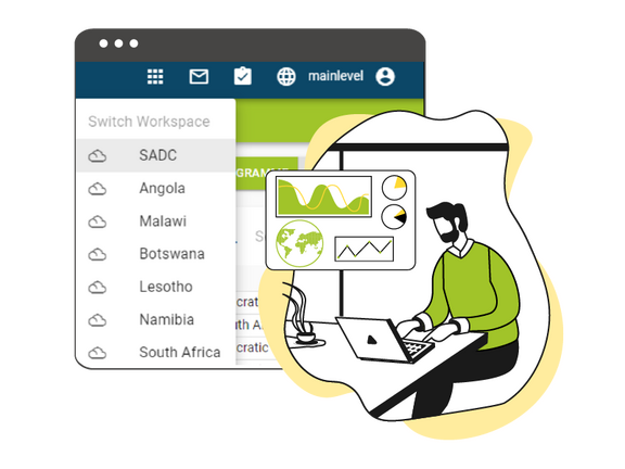 You can collect and analyse data from within a workspace, e.g. for a single project. Then you can aggregate data from multiple related workspaces, e.g. across regions or countries.
